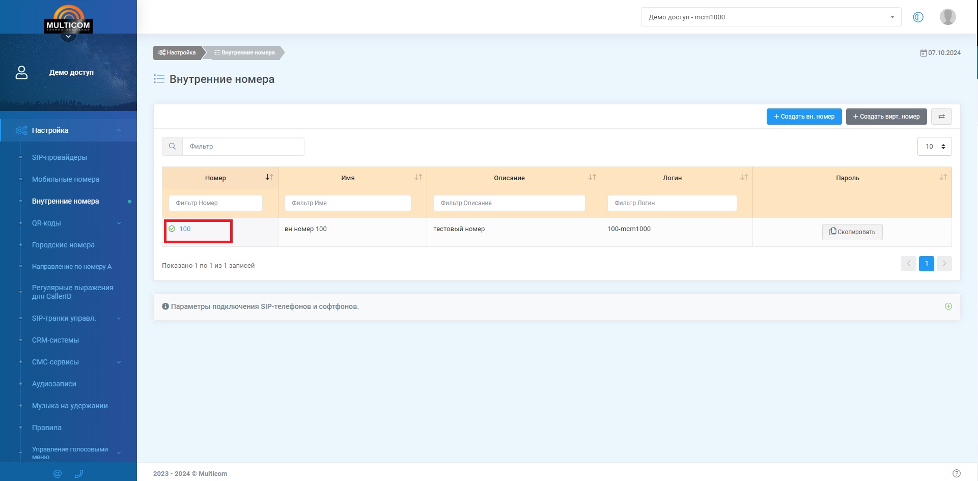 ► В левом вертикальном меню откройте раздел «Настройка» и выберите пункт «Внутренние номера».