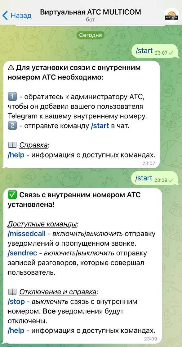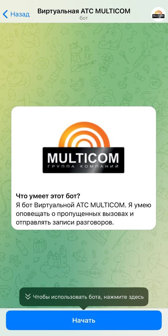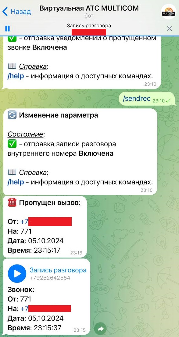 Каждый пользователь Виртуальной АТС MULTICOM имеющий внутренний номер может получать сообщения о пропущенных и записи разговоров своих исходящих вызовов в telegram бот @vatsmcmbot